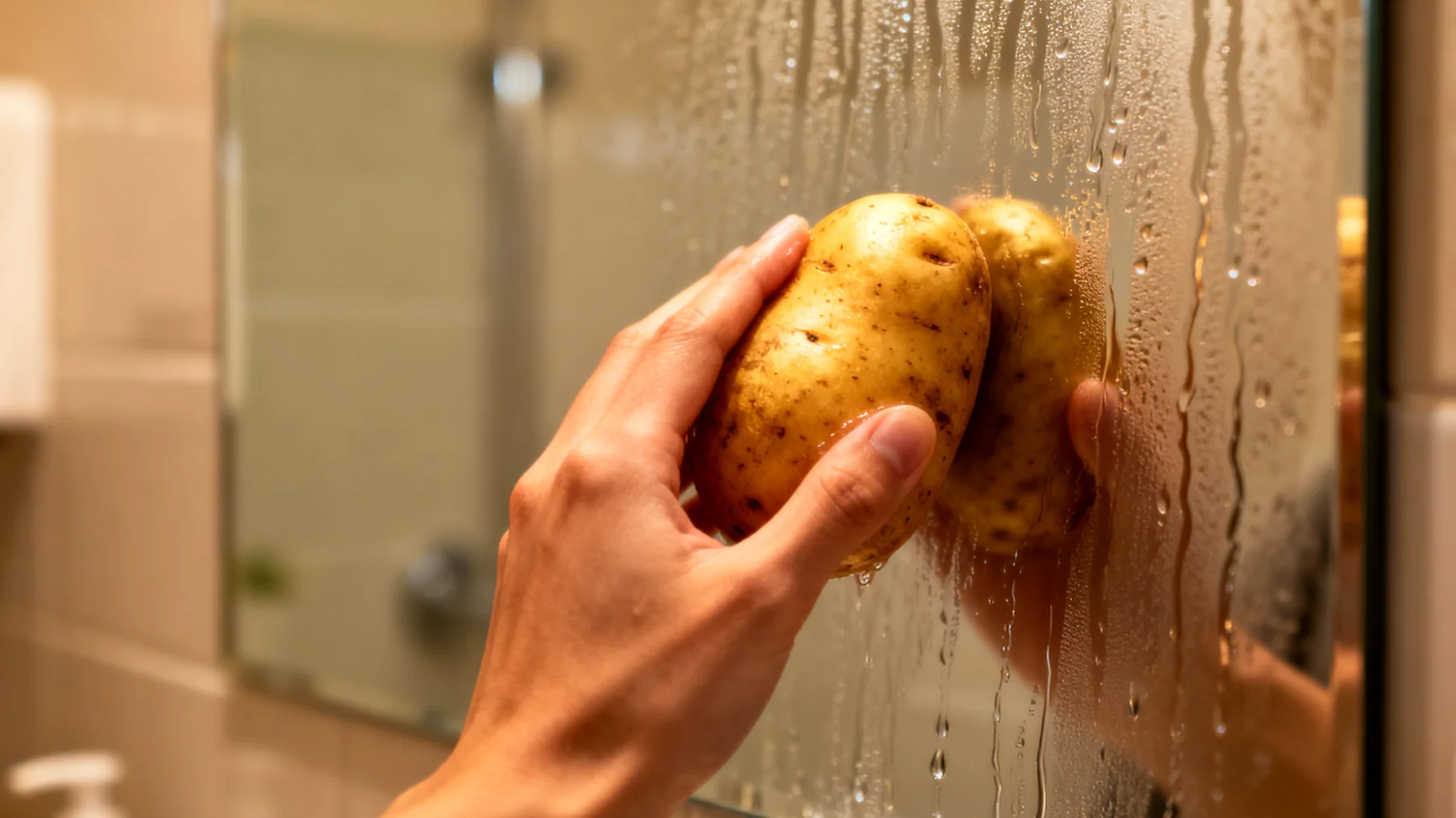 Tagliando una patata cruda si espone una superficie ricca di amido, un polisaccaride presente in concentrazioni elevate in questo tubero. Secondo la teoria popolare tramandata, strofinando questa superficie sul vetro si creerebbe una sottile pellicola che modifica il comportamento dell’acqua sulla superficie dello specchio. Il principio ipotizzato è che l’amido possa alterare la tensione superficiale, impedendo alle molecole d’acqua di aggregarsi in goccioline visibili e favorendo invece la formazione di un velo uniforme e trasparente, oppure facilitando lo scivolamento delle gocce.